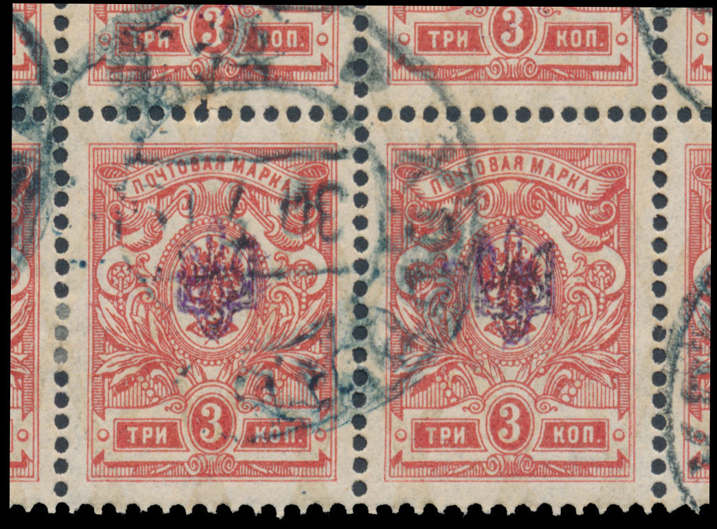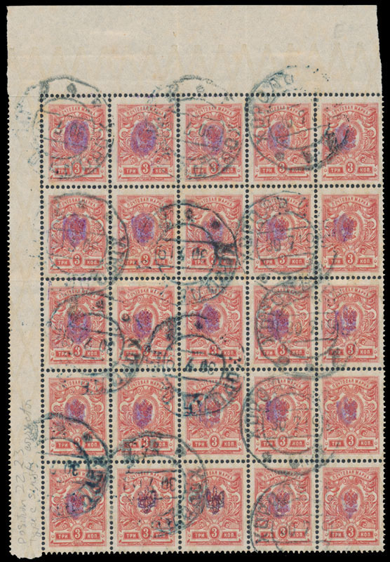 1918, violet overprint (type 1) on 3k red, top left corner margin pane of 25, stamps on positions 22-23 with double violet and black overprints, Khorol postal cancellation, ex-Dr. Zelonka, VF and rare item, especially in used condition, Est. $300-$400, Bulat #944 (983)