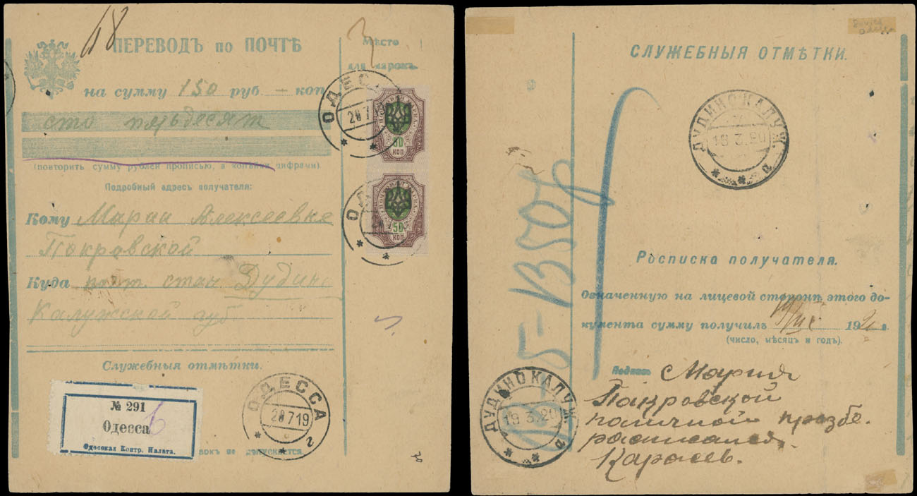 1919, money order for 150rub sent from Odessa to Kaluga Gub., franked by vertical perforated pair of 50k violet and green bearing black (type 2) overprint, postmarked on arrival, usual pinholes, stamps are not affected, mostly VF, Est. $200-$250 , Bulat #1110