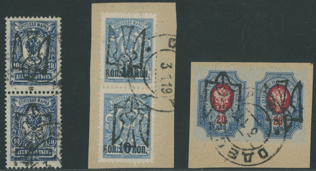 1918, black overprint (type 5) on 10k, 10k/7k and 20k, two vertical and one horizontal tete-beche pairs, all are postally used, VF and very scarce, experts’ hs on reverse, ex-Dr. Zelonka, Catalog has no value for used tete-beche pairs, Est. $300-$350, Bulat #1192a- 93b, 1196b