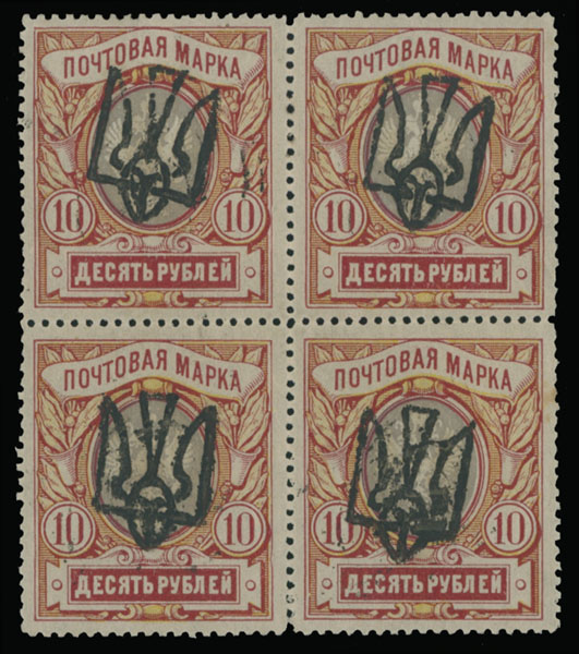 1918, black overprint (type 5) on perforate 10r red, yellow and gray, block of four, full OG, NH (3) or VLH, VF and scarce multiple, ex-Dr. Zelonka, C.v. $500++, Est. $250-$300 , Bulat #1206