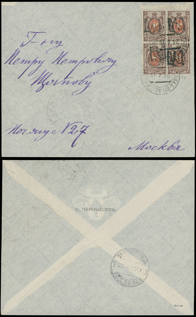 1919, black overprint (type 2) on perforated 70k brown and orange, block of four used on cover from Pavlivka to Moscow (Schapov’s correspondence), arrival ds, VF, signed by J. Bulat, Est. $200-$250 , Bulat #1440
