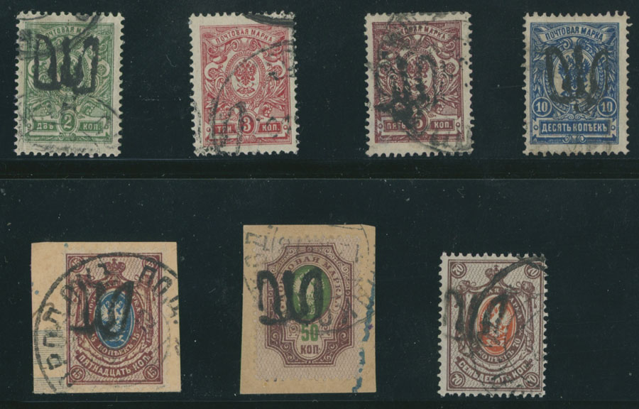 1908, black overprint (type 9) on perforated 2k-70k, set of seven values, all are postally used, two cancelled on pieces, mostly F/VF, the ”key” stamps properly expertized, C.v. $309, Est. $150-$200 , Bulat #1497/ 509