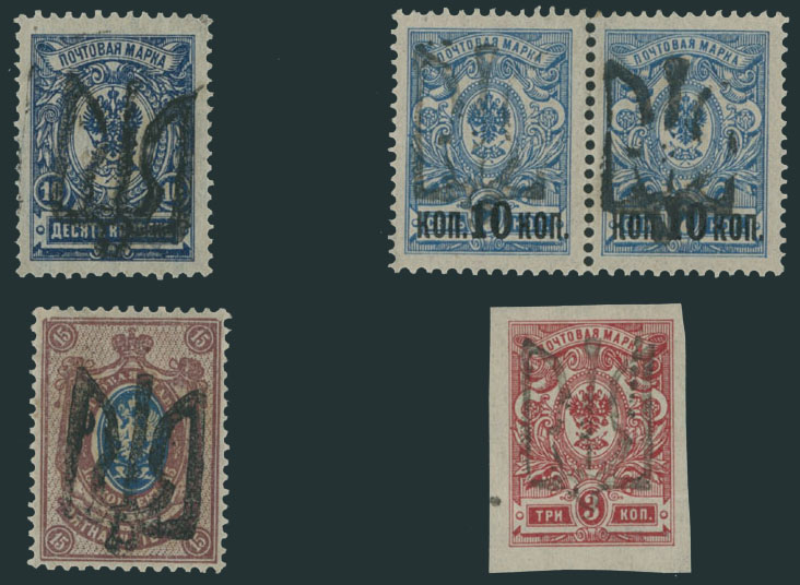 1918, black overprint (type 47) on perforated 10k, 10k/7k (horizontal pair), 15k and imperforate 3k, nice and fresh, full OG, LH or hinged, VF, expertized by J. Bulat, U.P.V. and others, C.v. $155, plus 10k and 15k priced with -‘-, Est.$350-$400, Bulat #2052/58
