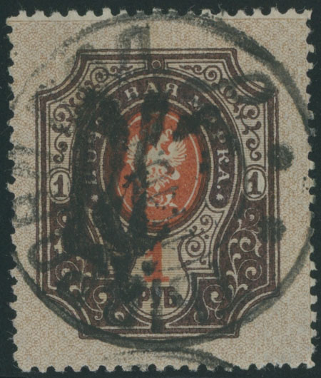 1918, black overprint (type 51) on perforated 1r brown, pale brown and orange, practically complete Tyvriv cancellation, VF, the stamp priced with -‘- in the catalog, Est. $150-$180 , Bulat #2112
