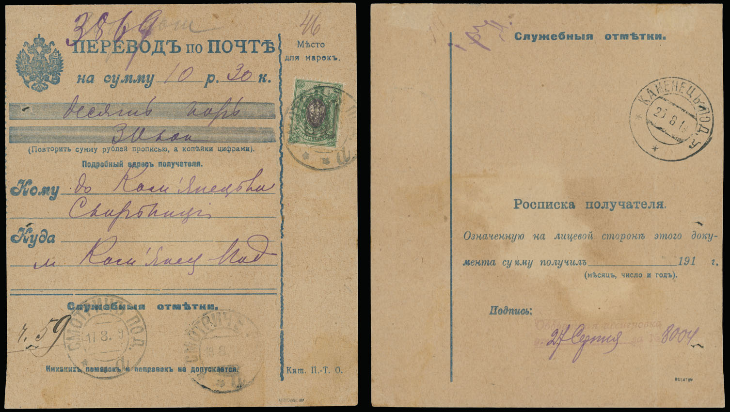 1919, black overprint (type 52) on 25k green and violet, used on money order for 10.30krb from Smotrich to Kam’yanets’-Podil’s’kyi, appropriate markings, archival holes at left, F/VF, Est. $200-$250 , Bulat #2129