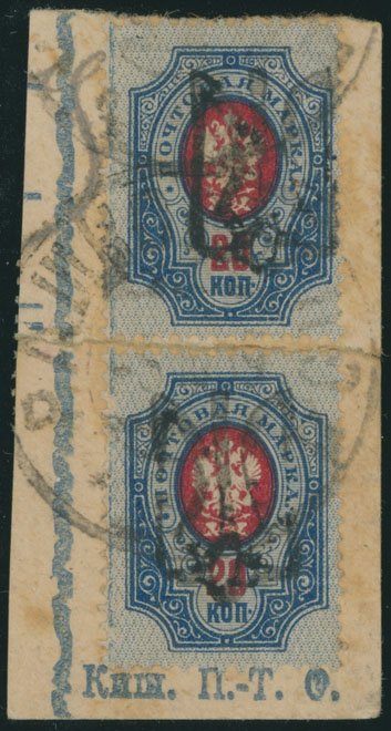 1918, black overprint (type 54) on perforated 20k blue and red, two stamps cancelled on small part of money order, F/VF, ex-Dr. Zelonka, C.v. $280, Est. $150-$180 , Bulat #2151