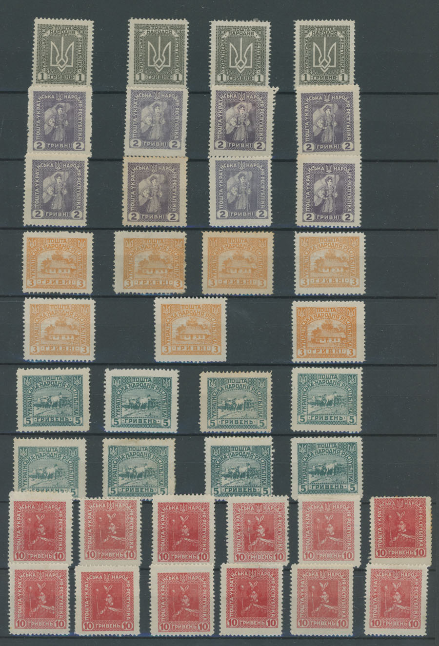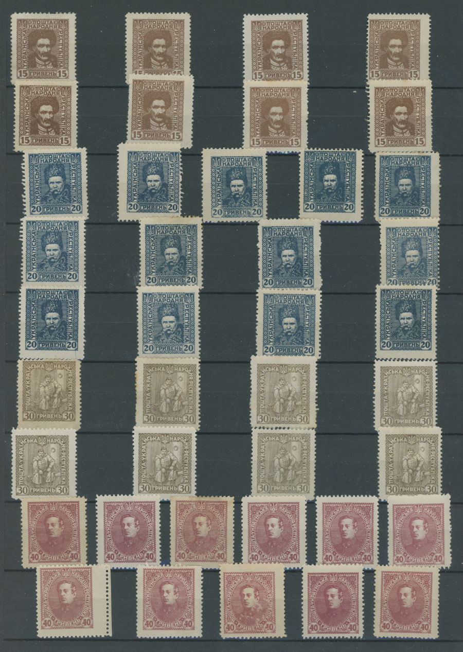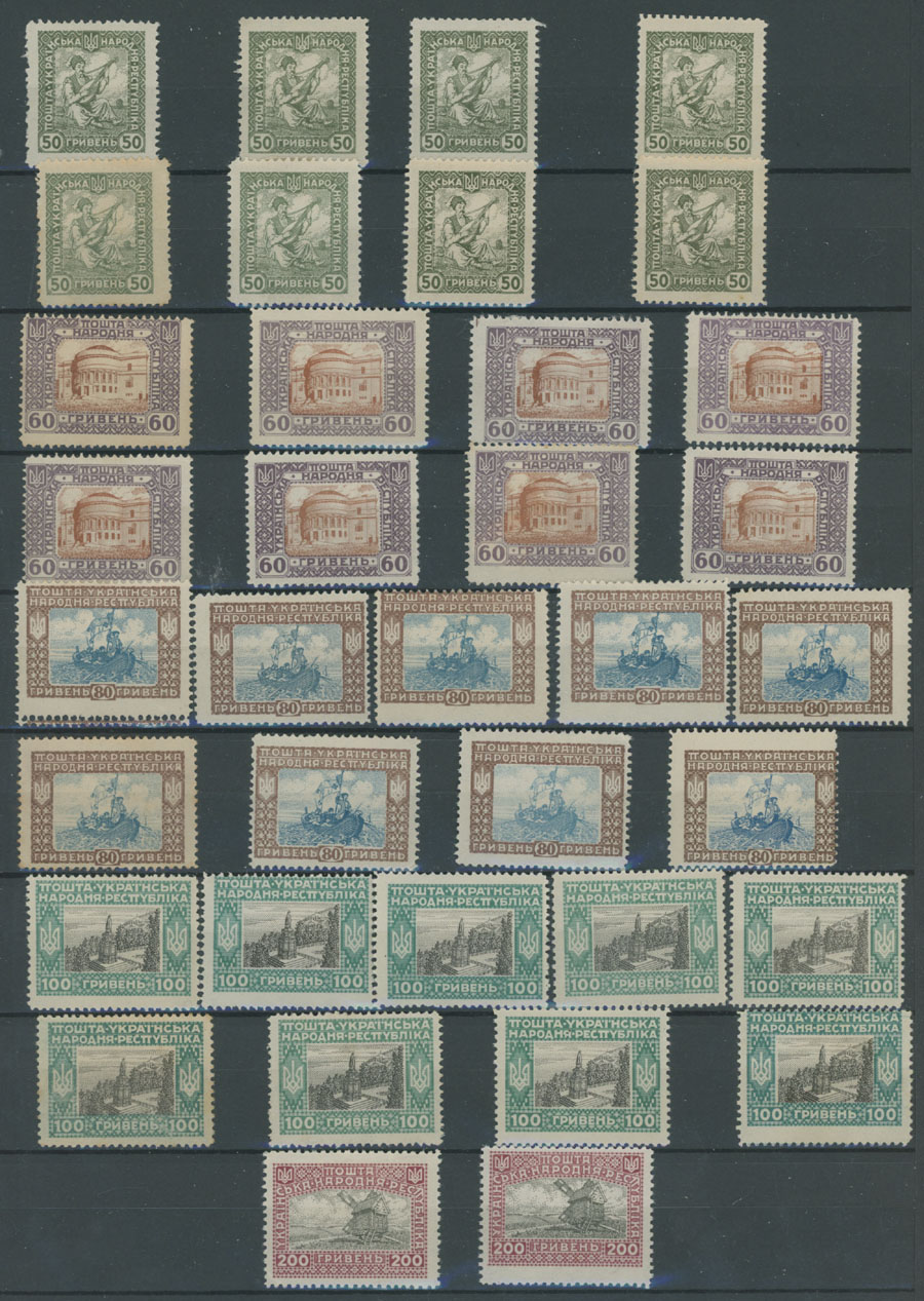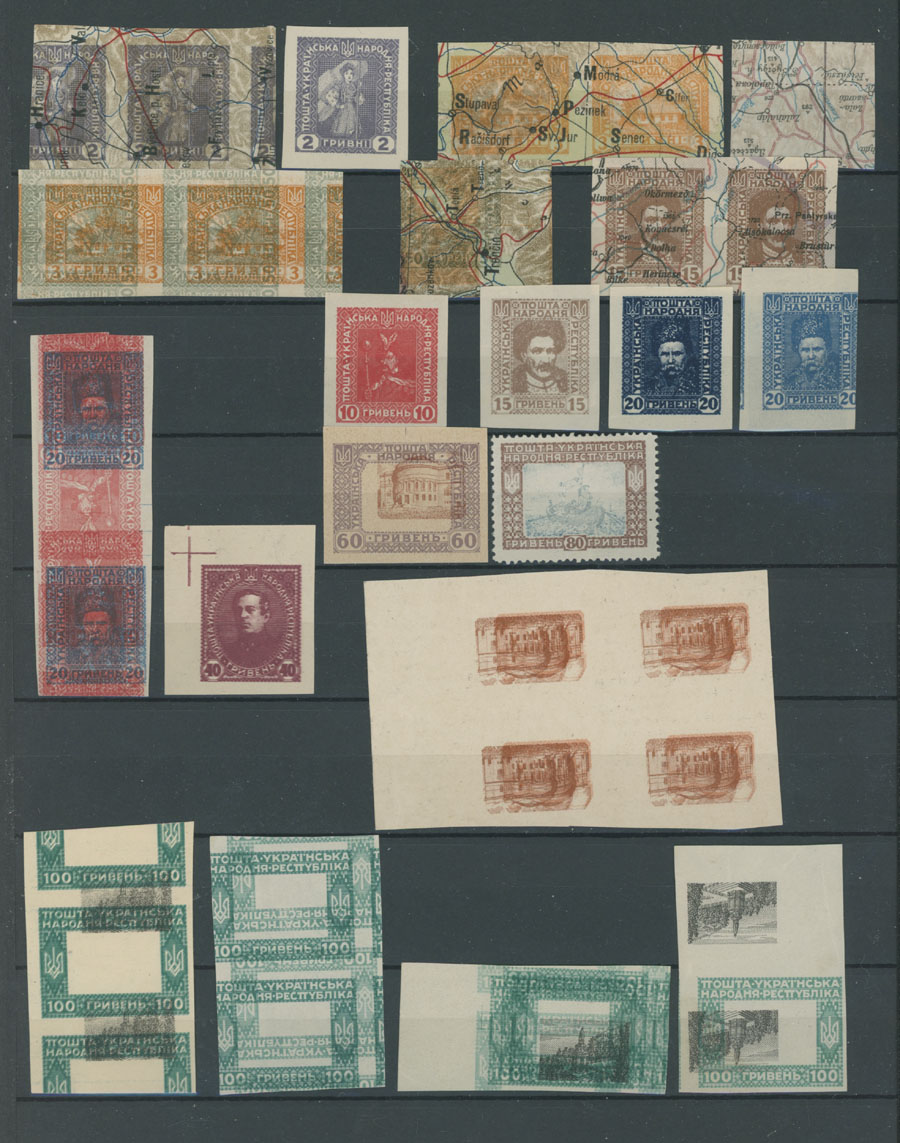 1920, 114 perforated and 30 imperforate stamps or proofs with double-triple printing on front and reverse, partial print of center or frame and etc., mainly full/large part of OG or no gum as produced, F/VF, Est. $200-$250 , Bulat #V27-40