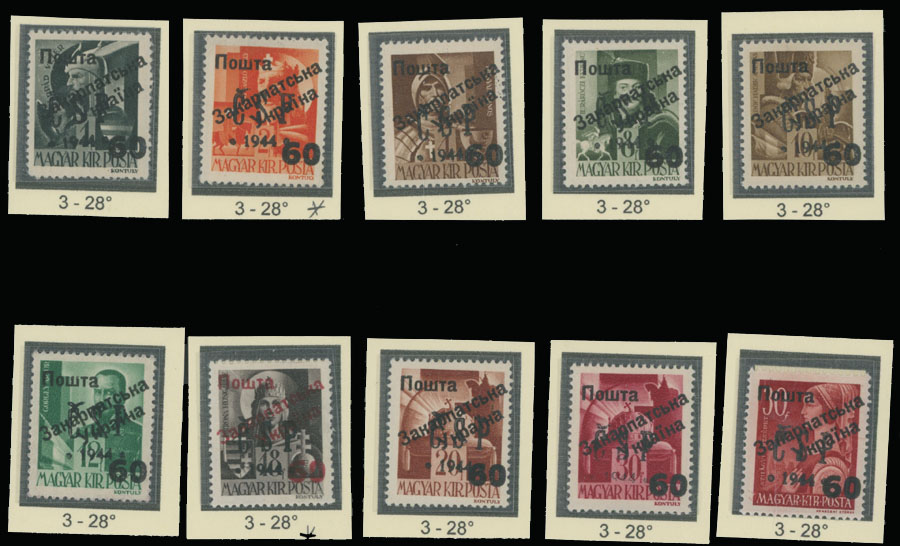 1945, Definitive and Great Women issues, black or red surcharges ”60” over black handstamped overprints ”CSP. 1944” on 1f-30f, set of ten, all surcharges of type 3 under 28 degree angle, full OG, NH or LH (2), VF, each with Dr. Blaha expert’s hs, C.v. CZK73,100=US$3,175, Est. $1,200-$1,500, Majer #CU1-10