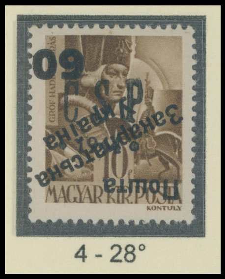 1945, inverted black surcharge ”60” over black ”CSP. 1944” on Count Hadik 10f brown, surcharge type 4 under 28 degree angle, full OG, NH, VF and extremely rare, only three stamps exist, expertized by Dr. Blaha, C.v. CZK250,000=US$10,850 , Majer #CU5Pp