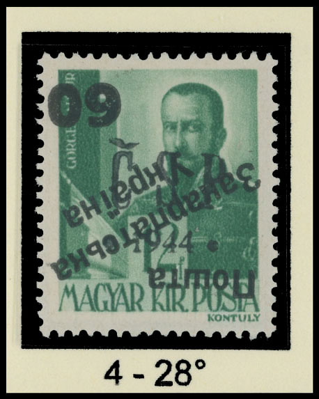 1945, inverted black surcharge ”60” over black ”CSP. 1944” on A. Gorgey 12f emerald, surcharge type 4 under 28 degree angle, full OG, NH, VF and extremely rare, only three stamps were surcharged, expertized by Dr. Sevke and Hrabar, C.v. CZK250,000=US$10,850, Est. $4,000-$5,000, Majer #CU6Pp