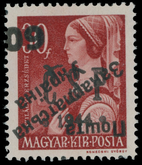 1945, inverted black surcharge ”60” over black ”CSP. 1944” overprint on E. Szilagyi 30f brown red, surcharge type 5 under 28 degree angle, full OG, NH, VF, a rarity – one of three produced stamps, expertized by Dr. Blaha, C.v. CZK250,000, Est. $4,000-$5,000, Majer #CU10Pp