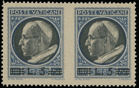 1946, black surcharge L.5 with three bars at each side (5 mm) on 2.50L light blue and black, horizontal pair imperf between stamps, full OG, VLH, VF, Sassone #107r, C.v. €1,000, Est. $150-$180 , Scott #107 var