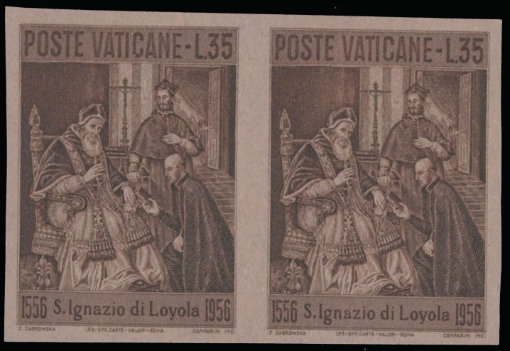 1956, 400th Death Anniversary of St. Ignatius Loyola, imperforate plate proof of 35L in red brown (issued color), horizontal pair printed on pink paper, full OG, NH, VF and rare, Est. $400-$500 , Scott #212