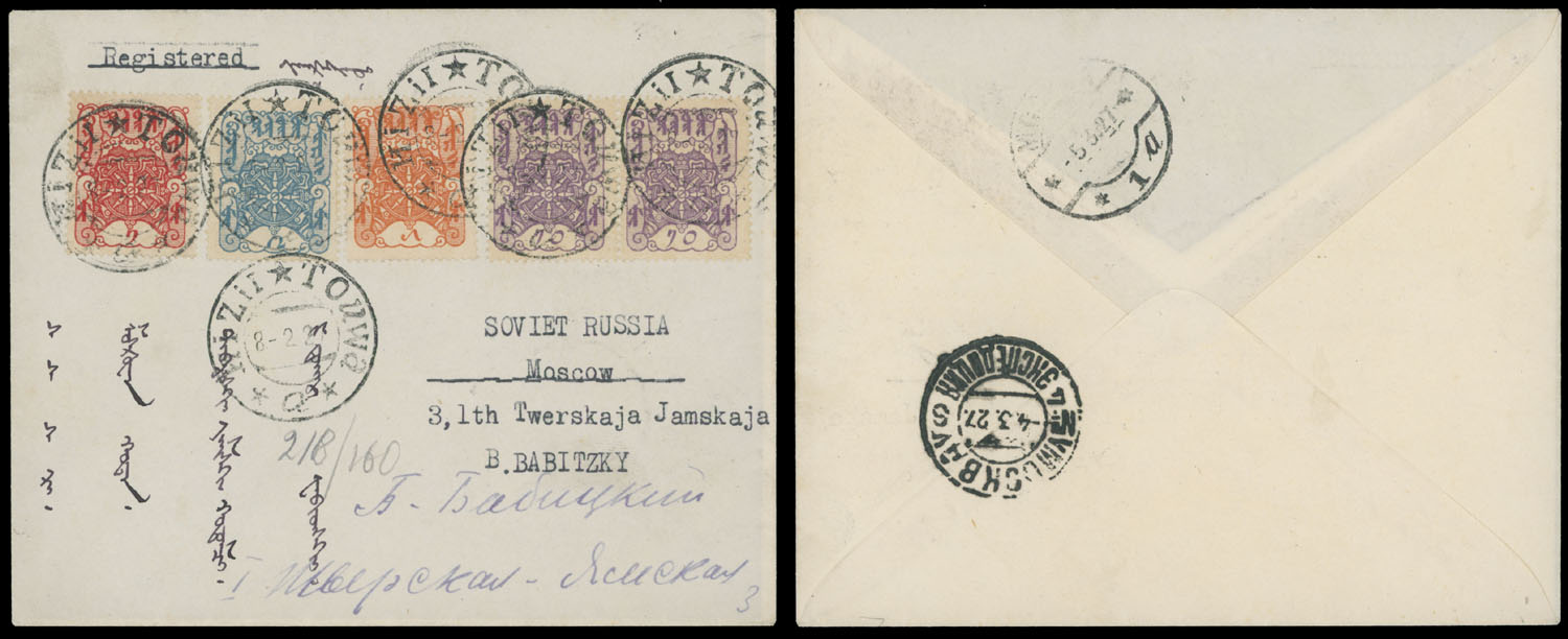 1927 (February 8), registered cover from Tannu Tuva to Moscow, franked by five Wheel of Eternity stamps, met altogether 28 kop postal rate, tied by Kyzyl postal cancellation (Ustinovsky No.0.1), two Moscow arrival markings of March 3 and 4, VF, Est. $300-$400, Scott #1-3, 5 x2
