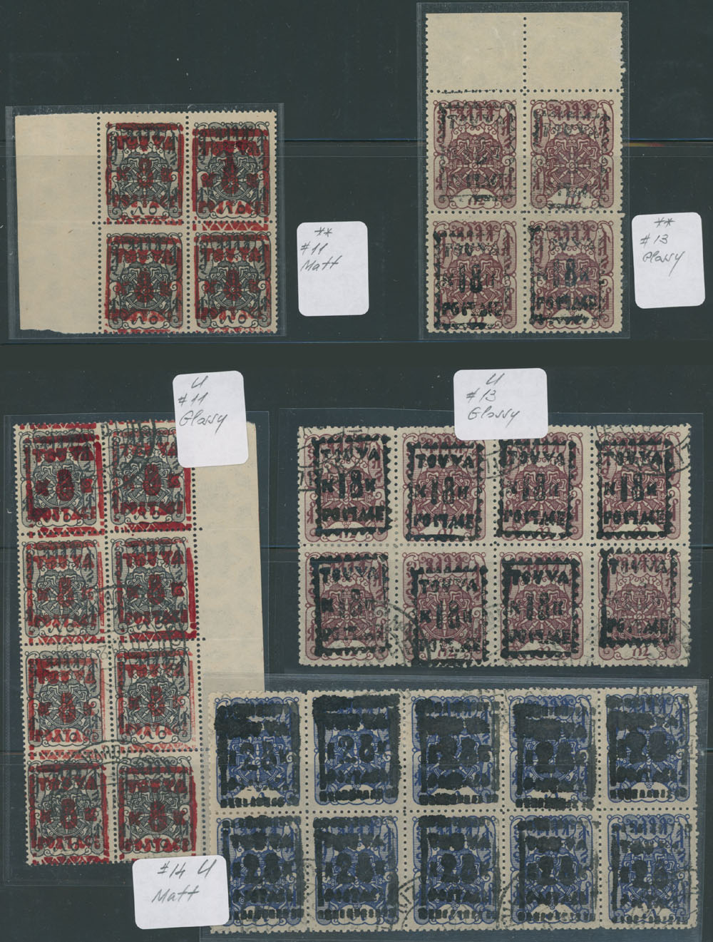 1927, red surcharge 8k/50k and black surcharge 18k/3r, two sheet margin blocks of four; in addition blocks of eight 8k/50k and 18k/3r plus 28k/5r in block of ten, the last ones with ”10.VI.27” Kyzyl cancellations, full OG, NH or used, VF, multiples of the early issues are rare, C.v. $725 as singles, Est. $300-$350, Scott #11, 13-14