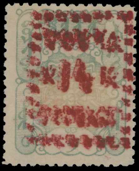 1927, double red matt surcharge 14k on 1r blue green, traces of original gum, VF centering of this rare stamp, Est. $200-$250 , Scott #12b