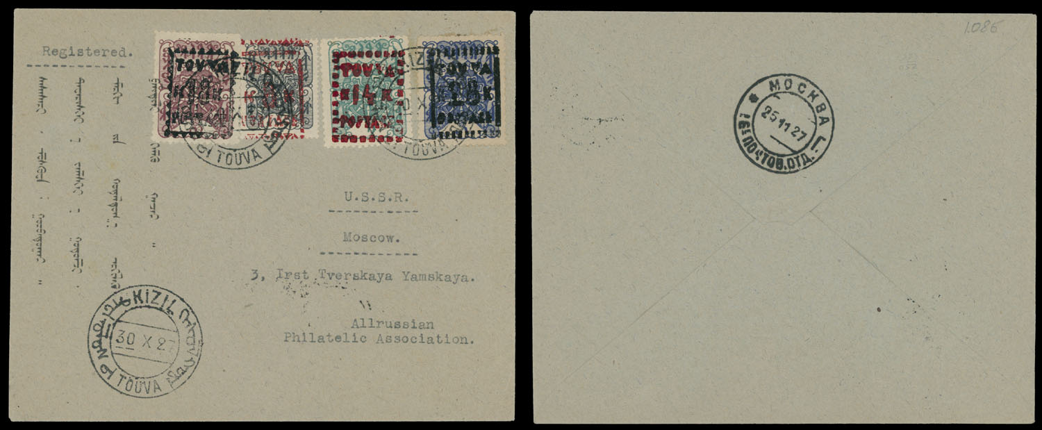 1927 (October 30), red surcharges 8k/50k (matt) and 14k/1r (glossy); black glossy surcharges 18k/3r and 28k/5r, complete set of four, used on registered cover from Tannu Tuva to Moscow, tied by Kyzyl bilingual ds (Ustinovsky No.0.2), Moscow ”25.11.27” receiver, VF and rare, Est. $400-$500, Scott #45975