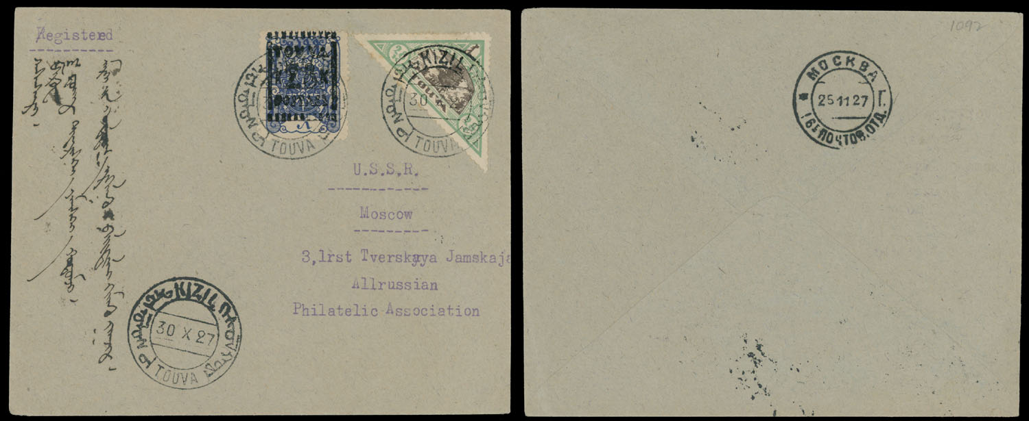 1927 (October 30), black glossy surcharge 28k/5r and triangle stamp of 28k from the definitive issue of 1927, used on registered cover from Tannu Tuva to Moscow, tied by Kyzyl bilingual ds (Ustinovsky No.0.2), Moscow ”25.11.27” arrival marking, VF, Est. $400-$500, Scott #14, 24