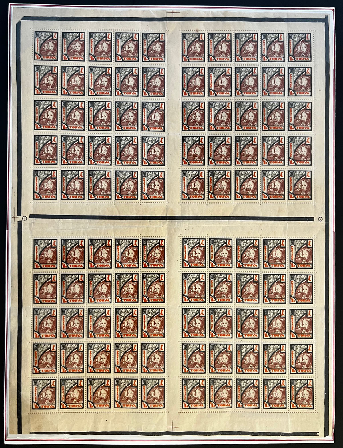1927, Tuvan Girl, 1k black, red brown and red orange, complete gutter pane of 100 (25 x4), black control lines on outer margins and horizontal between panes, folds along the horizontal gutter, still full OG, NH, VF and rare multiple, Est. $200-$250, Scott #15