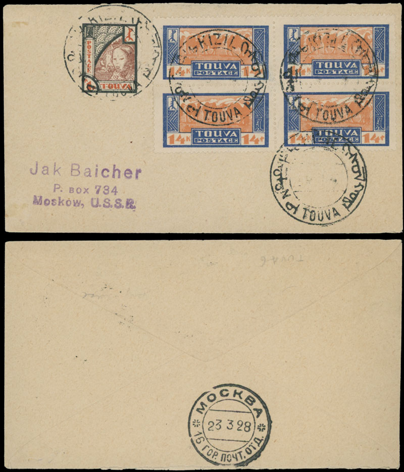 1928, overfranked cover from Kyzyl to Moscow, bearing a single of Tuvinian Girl 1k and Camel Caravan 14k in block of four, tied by unclear date postal marking (Ustinovsky No.0.2), ”23.3.28” Moscow receiver is on reverse, VF, Est. $200-$250 , Scott #15, 22 x4