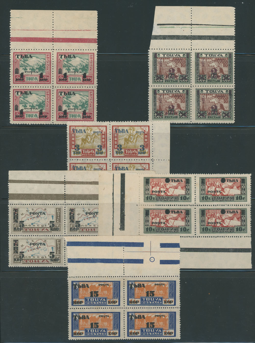 COLLECTION: 1932, 1k/50k – 15k/14k, complete set of six, sheet or corner sheet margin blocks of four, in addition complete set of singles and cancelled set of five (no 1k/50k), full OG, NH (blocks) or hinged (single set), mostly VF, set of blocks is very scarce, C.v. $630++, Est. $400-$450, Scott #29-34
