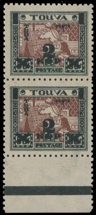 1932, black instead of brown surcharge 2k on 50k black, green and red brown, vertical bottom sheet margin pair, perforation 10, full OG, NH, VF and very rare, only one sheet of 100 stamps was found, Est. $1,000-$1,200 , Scott #30 var