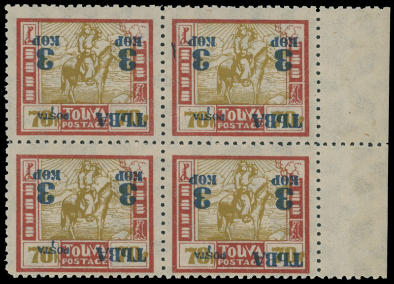 1932, inverted blue surcharge 3k on 70k red and bister, right sheet margin block of four, full OG, NH, VF, C.v. $2,400 as singles, Est. $800-$1,000 , Scott #31a