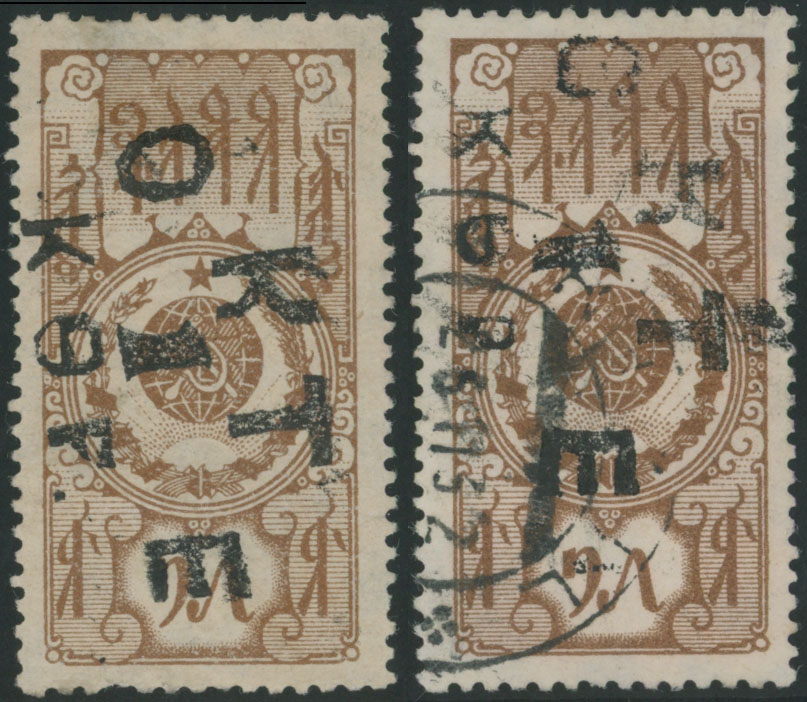 1932, inverted handstamp 1k on fiscal stamp of 15k brown, unused and used singles, first one with part of OG and perf irregularities at top and bottom, still F/VF, Ustinovsky #C1 I, Est. $300-$350