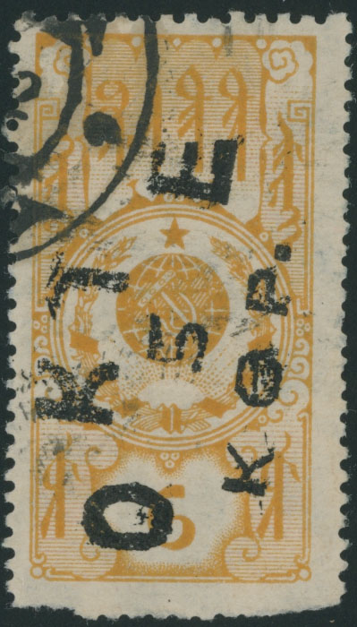 1932, black handstamp 5k on fiscal stamp of 6k yellow, a part of postal cancellation at top left, perforation defect at bottom, still F/VF and very rare, Ustinovsky #C3, Est. $500-$600