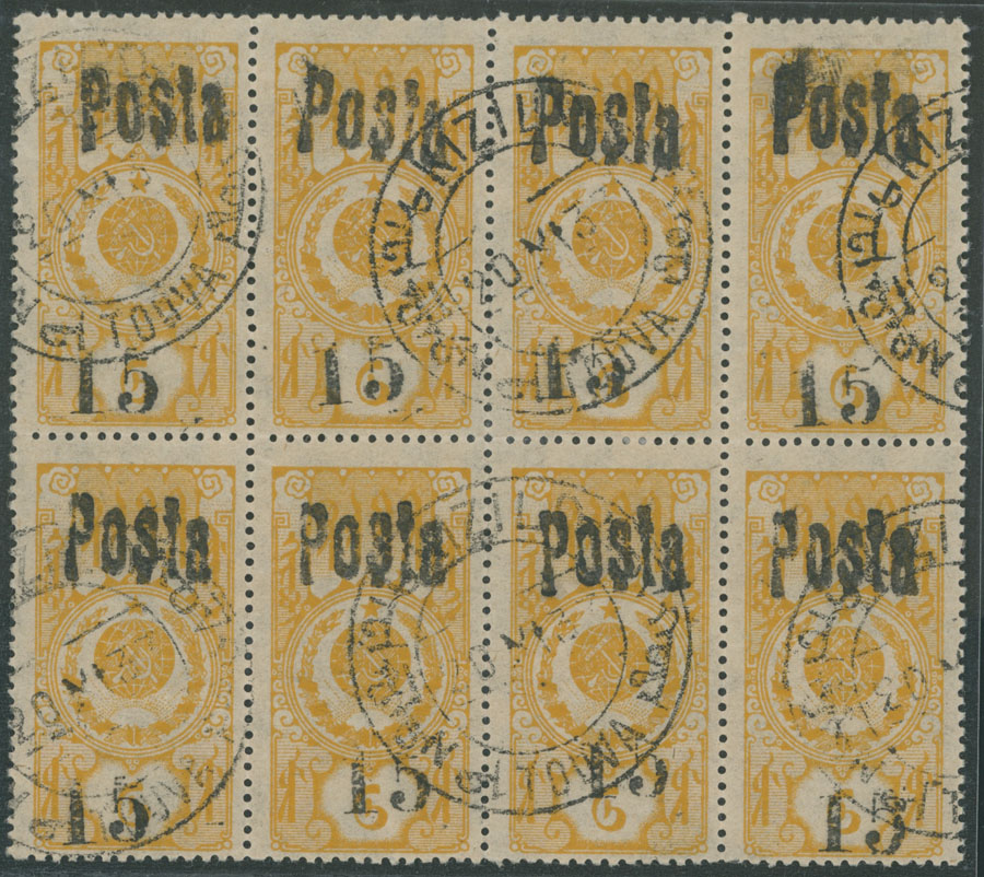 1933, black handstamp (large figures – 6.7mm. type II) 15 (k) on 6k yellow, block of eight, CTO dated ”20.XI.33” (Ustinovsky No.0.2), full OG, VF and scarce multiple, C.v. $1,200 as singles, Est. $600-$700 , Scott #40 var