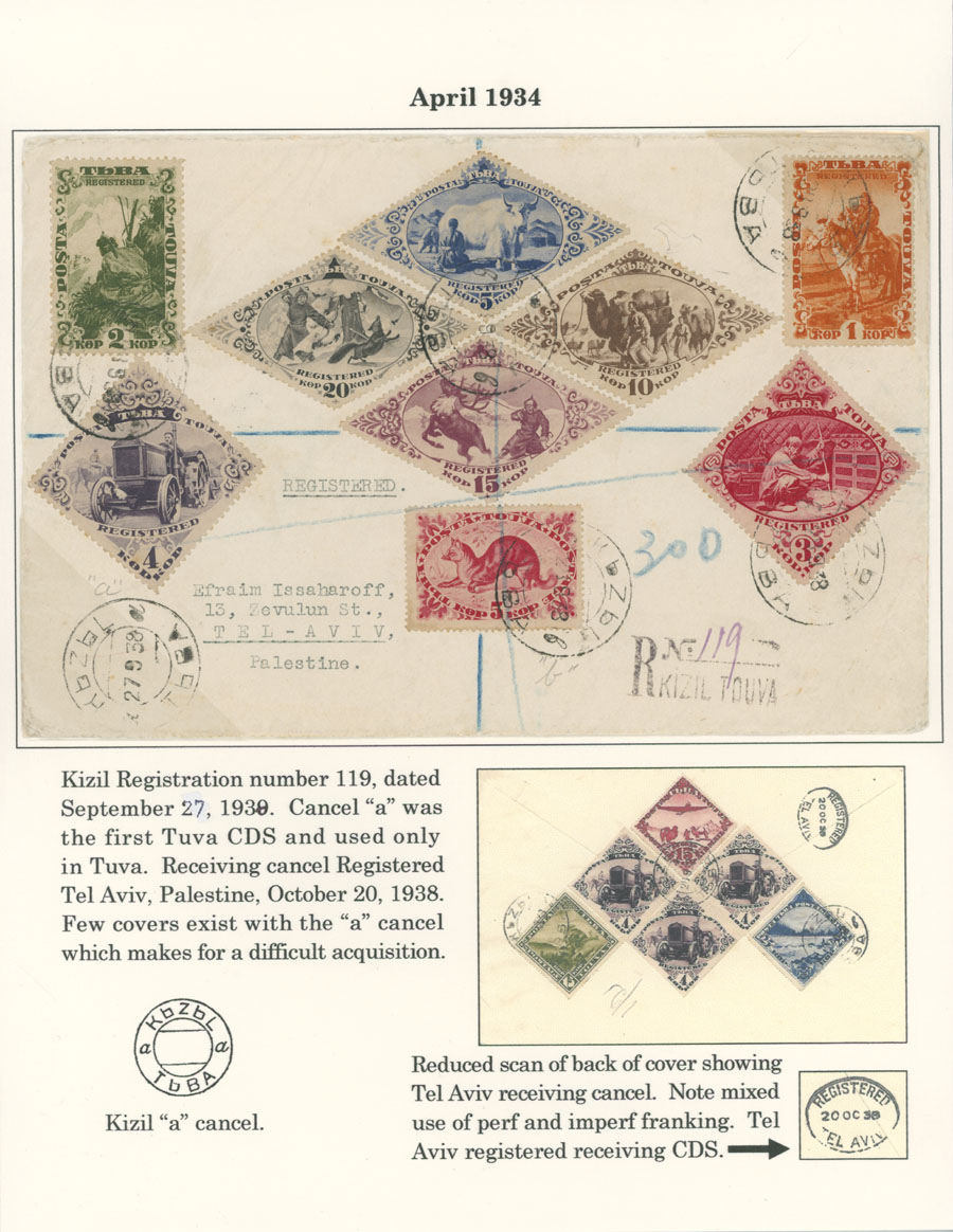 1938 (September 27), registered cover from Kyzyl to British Palestine, franked altogether by 15 stamps (6 – on reverse), including 1k-20k complete set of eight, tied by letter ”a” date stamp (Ustinovsky No.3.1), postmarked on arrival ”20.OC.38” in Tel Aviv, mostly VF and very rare, Est. $500-$600, Scott #45-52
