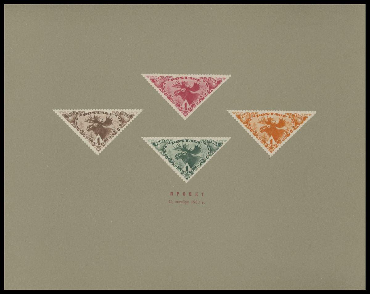 1935, Elk, four trial color perforated (perf 10) proofs of 1r in brown, carmine rose, gray green and orange, arranged on brown gray cardboard, text at the bottom reads: ”Project. 15 October 1933”, cardboard size 274x223mm, excellent condition, VF and very rare, just a few survived, Est. $3,000-$3,500, Scott #67