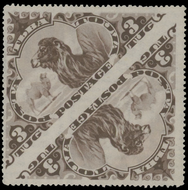 1935, Bactrian Camels, 3t brown, vertical tete-beche pair of triangle values, imperforate diagonally between stamps, full OG, LH, VF and rare, Est. $300-$400 , Scott #69 var