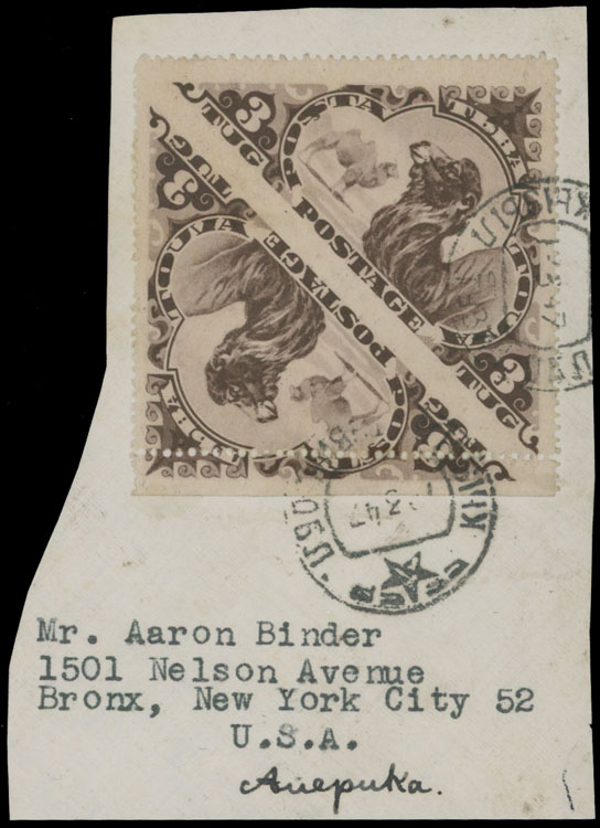 1935, Bactrian Camels, 3t brown, vertical tete-beche pair of triangle stamps, imperforate diagonally with vertical perforation at left strongly shifted to the design, cancelled on a piece from envelope sent to US in 1947, fresh, VF and rare, Est. $300-$400, Scott #69 var