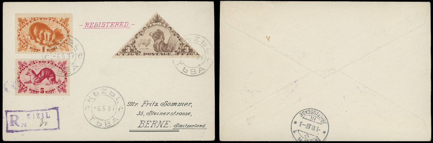 1937 (May 6), Badger 1k orange, Ermine 5k carmine and Camels 3t brown, three stamps used on registered cover to Switzerland, cancelled by black letter ”c” Kyzyl postmarks (Ustinovsky No.3.3), arrived in Berne on June 1, 1937, VF and scarce, Est. $400-$450, Scott #61, 63, 69