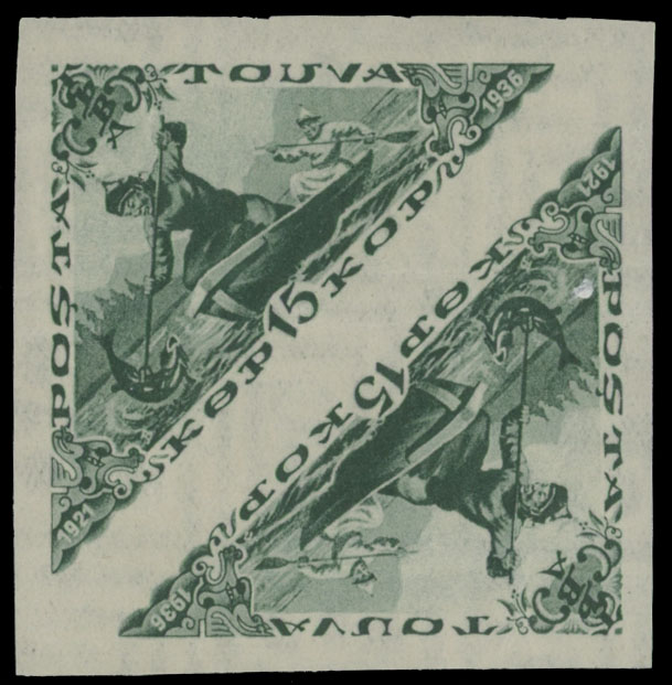 1936, Spearfishing, 15k dark green, imperforate pair of triangle stamps, nice margins all around, full OG, NH or LH, VF and rare, Est. $1,200-$1,500 , Scott #80 imp