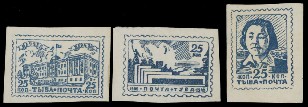 1942, Government Building 25k steel blue, Exhibition Hall 25k steel blue and Tuvinian Woman 25k steel blue, complete set of three, printed on thick paper, full original patchy yellow brown gum, NH, VF and very rare, each stamp with tiny ”SS” handstamp on reverse, C.v. $2,750, Est. $3,000-$3500, Scott #117-19
