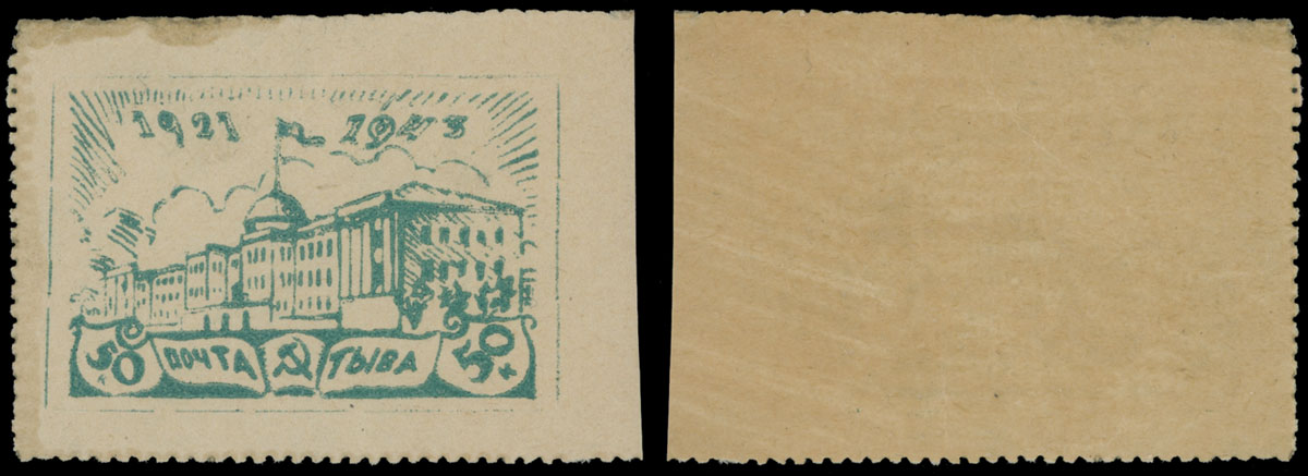 1943, Government Building 50k green, a single with perforation on the left and at the bottom, full original uneven yellow gum, NH, VF and scarce, listed in V. Ustinovsky’s Monograph, Est. $150-$180 , Scott #123 var