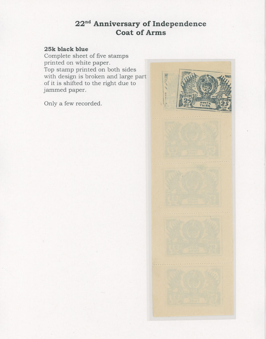1943, Coat of Arms, 25k black blue, complete sheet of five, printed on white paper, top stamp printed on both sides with reversal design is broken and large part of it is shifted to the right due to jammed paper, no gum as issued, NH, VF and very rare, just a few other such sheets recorded, Est. $600-$700, Scott #120a