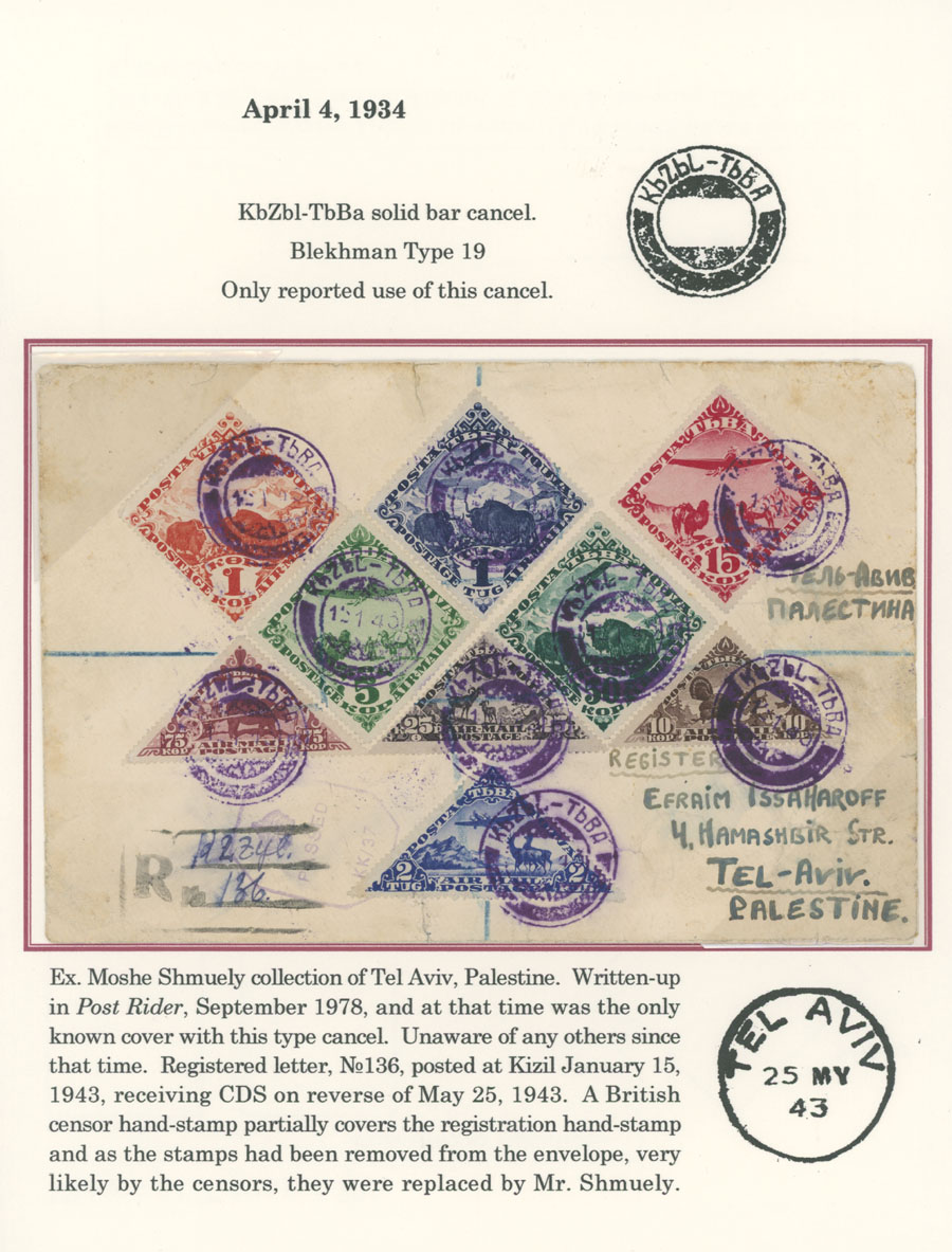 1943 (January 15), registered cover from Tannu Tuva to British Palestine, franked by complete 1st air post set of nine, tied by violet Kyzyl date stamp (Ustinovsky No.2.1), light impression British censorship is alongside, Tel Aviv ”25.MY.1943” arrival ds, some soiling and wearing, F/VF and very rare, arranged on a Collection page, ex-M. Shmuely, Est. $600-$700, Scott #C1-9