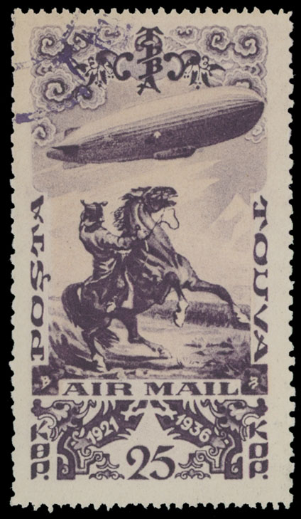 1936, Dirigible over Horseman, 25k violet and cream, compound perforation 14×11, CTO with full OG, VF and rare, Ustinovsky #111B, rank ”R”, Est. $200-$250 , Scott #C13b