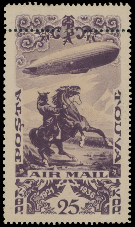 1936, Dirigible over Horseman, 25k violet and cream, compound perforation 14x14x14x10 with extra horizontal perf 14 at top, full OG, LH, VF and very rare, Est. $400-$500 , Scott #C13b var
