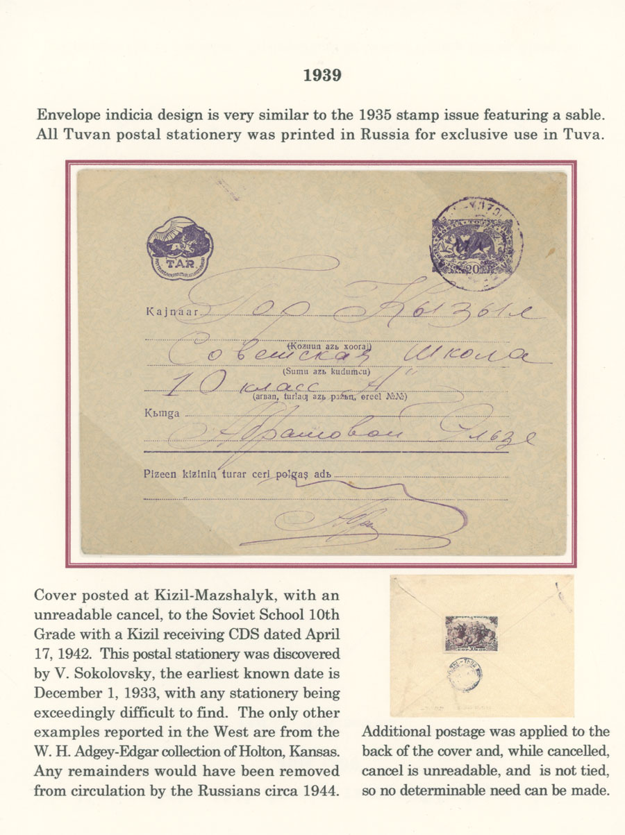 1939, stationery envelope 20k violet, printed on grayish yellow paper, size 163x128mm, interior type c, sent in 1942 from Kyzyl-Mazhalyk, tied by violet date stamp (Ustinovsky No.2.2), addressed to 10th grade of Soviet School in City of Kyzyl, violet arrival ”21.4.42” marking (Ustinovsky No.2.1), uprated by stamp of 30k on reverse (not cancelled), fresh quality, VF and extremely rare, only a few are known, Ustinovsky #K3, Est. $6,000-$7,000