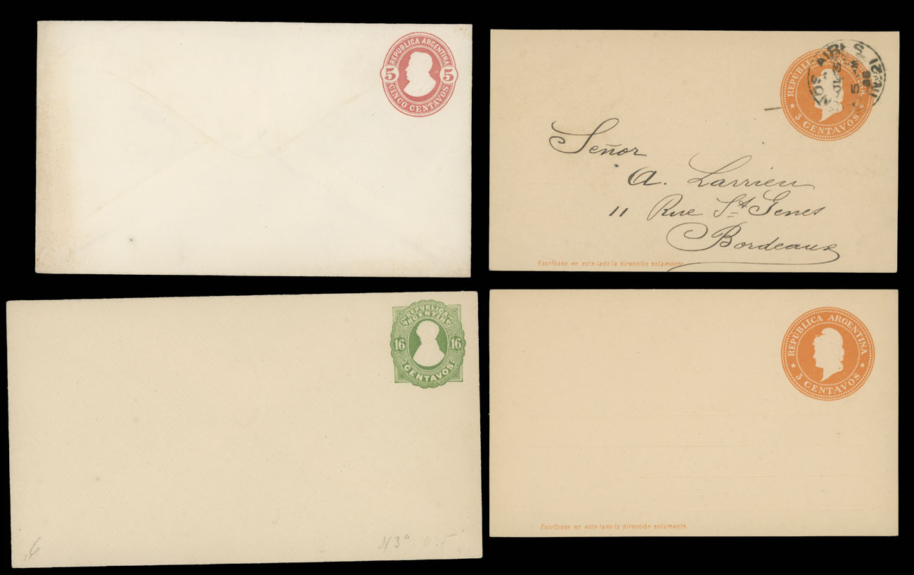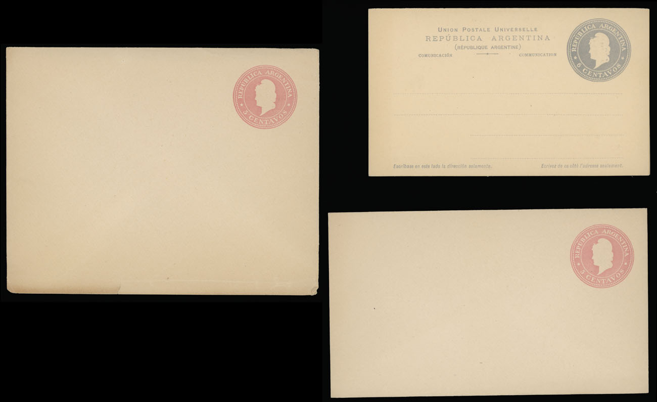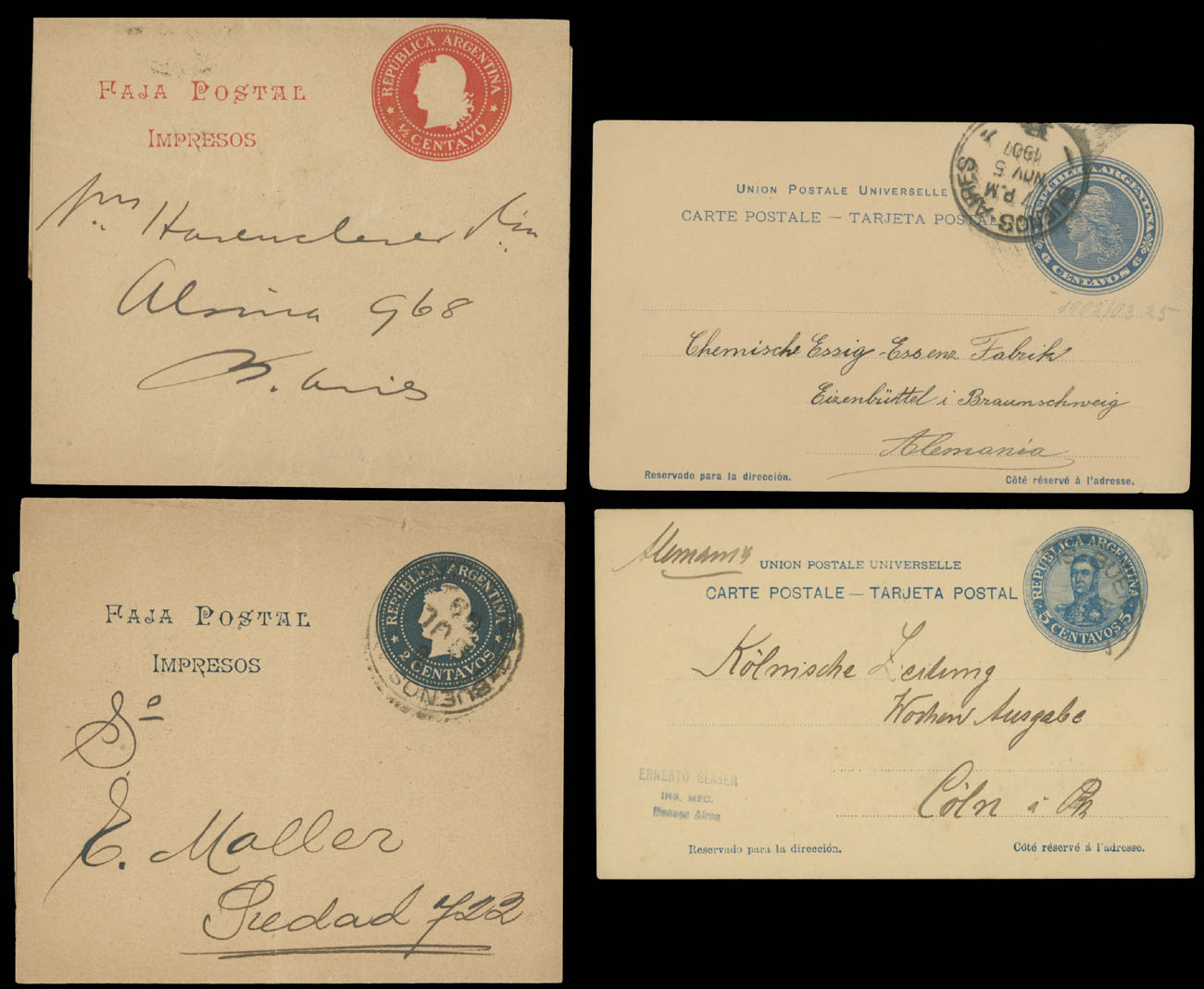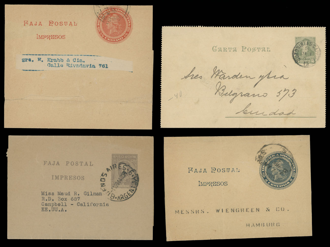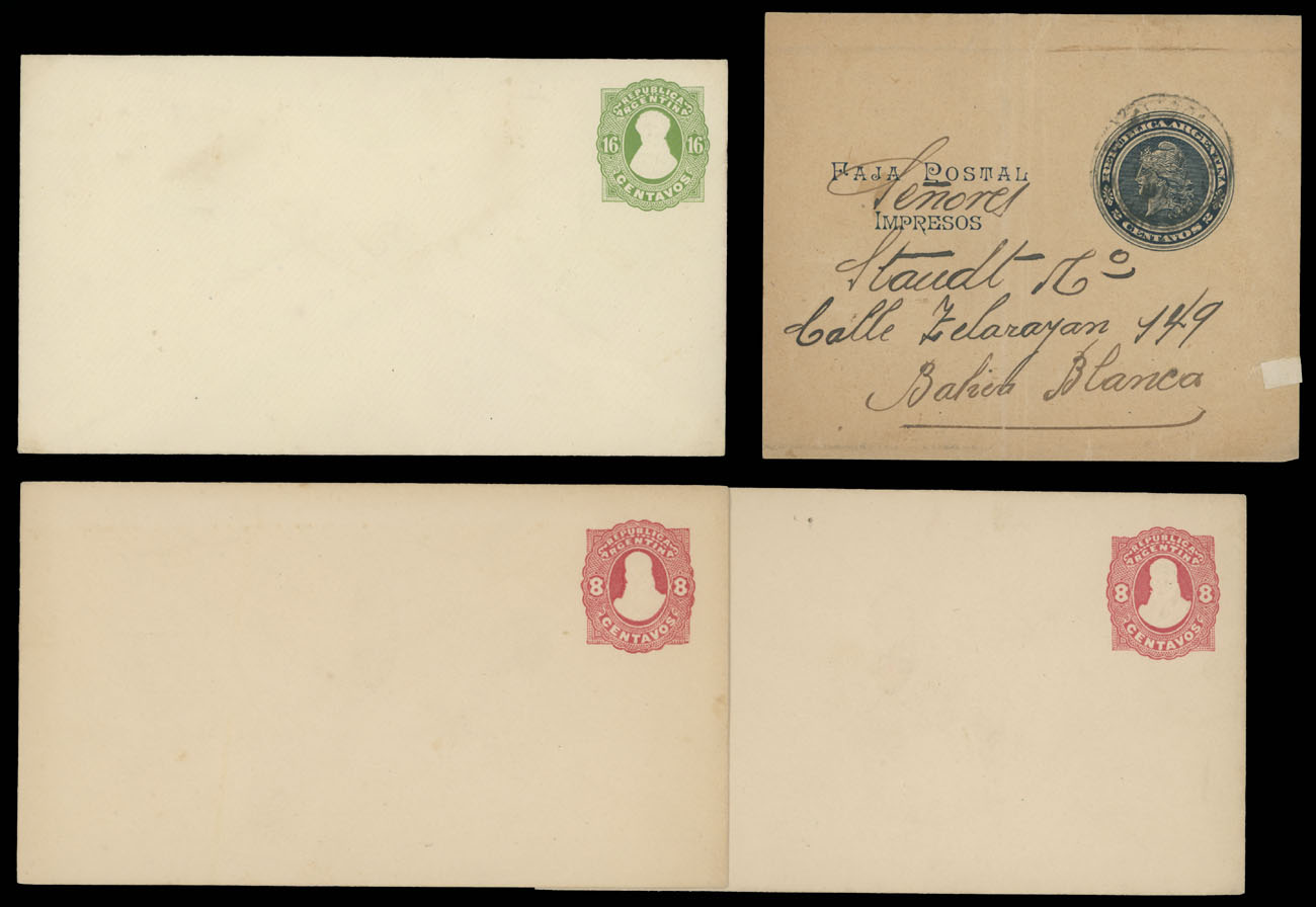 CLASSIC STATIONERY COLLECTION IN RED BROWN COVER ALBUM: 1890-1912, 164 used and unused items, including 73 wrappers (38 unused), 25 letter cards (18 unused), 38 envelopes (30 unused), 26 postcards (13 unused) and 2 unsevered reply cards, used ones are of various destinations, some better items, generally fresh quality unit, F/VF or better, Est. $300-$400