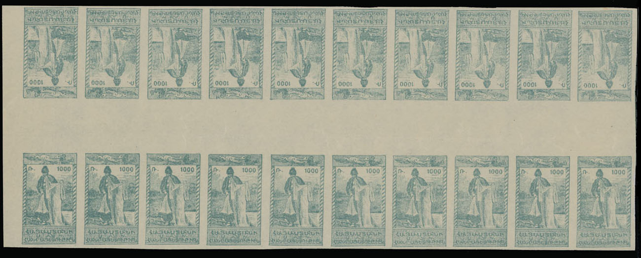 1921, First Constantinople issue, Fisherman 1000r blue green, left margin imperforate tete-beche block of 20 (10×2) with 22.5mm gutter in the middle, no bend or folds, perfect quality, full OG, NH, VF and scarce positional item, especially in sound condition, Est. $400-$500, Scott #287 var