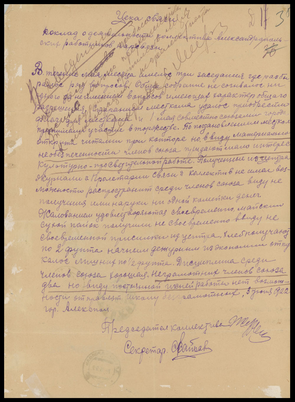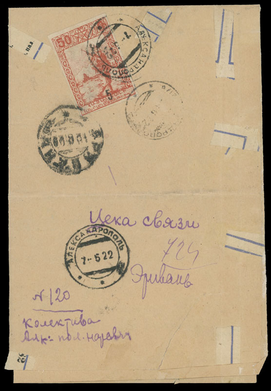 1922, black surcharge 5(k) on imperforate soldier 50r red, used on entire letter from Alexandropol to Yerevan (Minutes of Employees’ Meeting of the Post Office), appropriate markings, minor wears, still F/VF and very rare, Est. $600-$700 , Scott #390