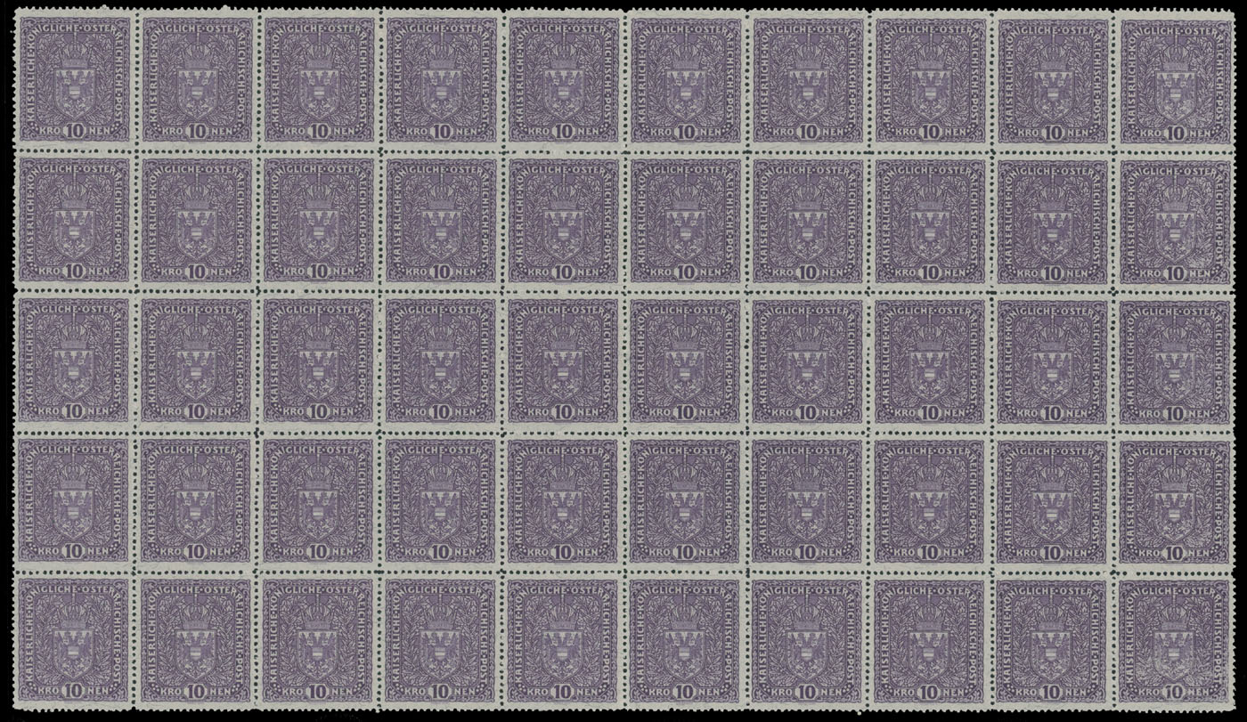 1919, Coat of Arms, 10k light violet, type II (26x29mm), printed on granite paper, block of 50 (10×5), one stamp with light reversal soiling, post office fresh quality, full OG, NH, VF, C.v. $1,300, ANK #211 II, C.v. €1,750++, Est. $300-$350 , Scott #175