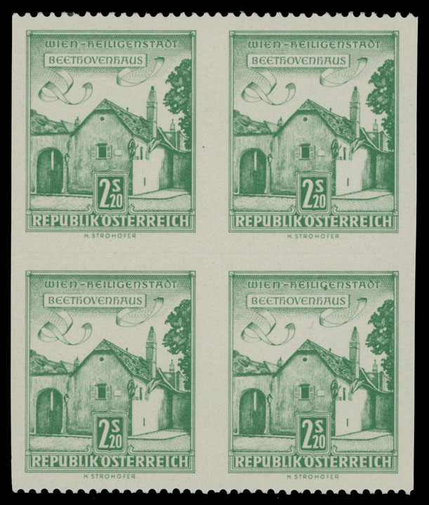 1962, The Beethoven House, 2.20s green, block of four, imperforate vertically and horizontally between stamps, perforated 13¾ at top and bottom only, full OG, NH, VF and scarce multiple, ANK #1103 var, Est. $300-$350 , Scott #697 var