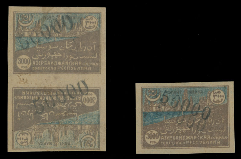 1922, black metal surcharge 50,000r on Soviet issue stamp of 3000r brown and blue, vertical tete-beche pair, upside down stamp has upright surcharge, in addition a single with double surcharge, dry brown gum (TB pair), or no gum as issued, mostly VF, several experts’ hs on reverse, including Dr. P. Jemtschoujin, Est. 200-$250, Scott #35, var