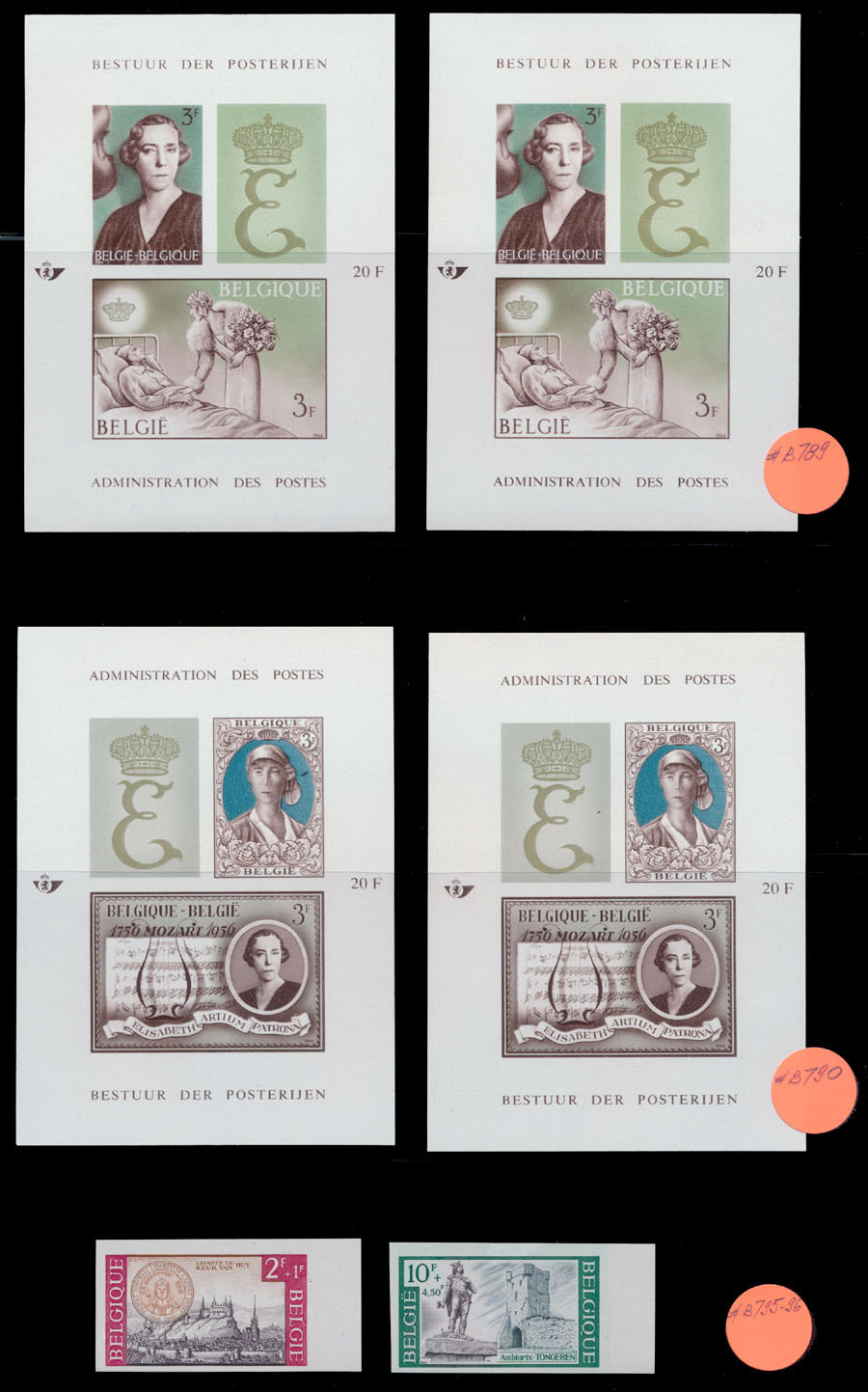 SMALL SELECTION OF SPECIMENS: 1966, Queen Elisabeth, two sets of two imperforate souvenir sheets and Historical places, set of two imperf stamps, each one numbered on reverse, nice and fresh condition, no gum as produced, NH, VF, COB C.v. €300, Est. $100-$120, Scott #B789/ 96